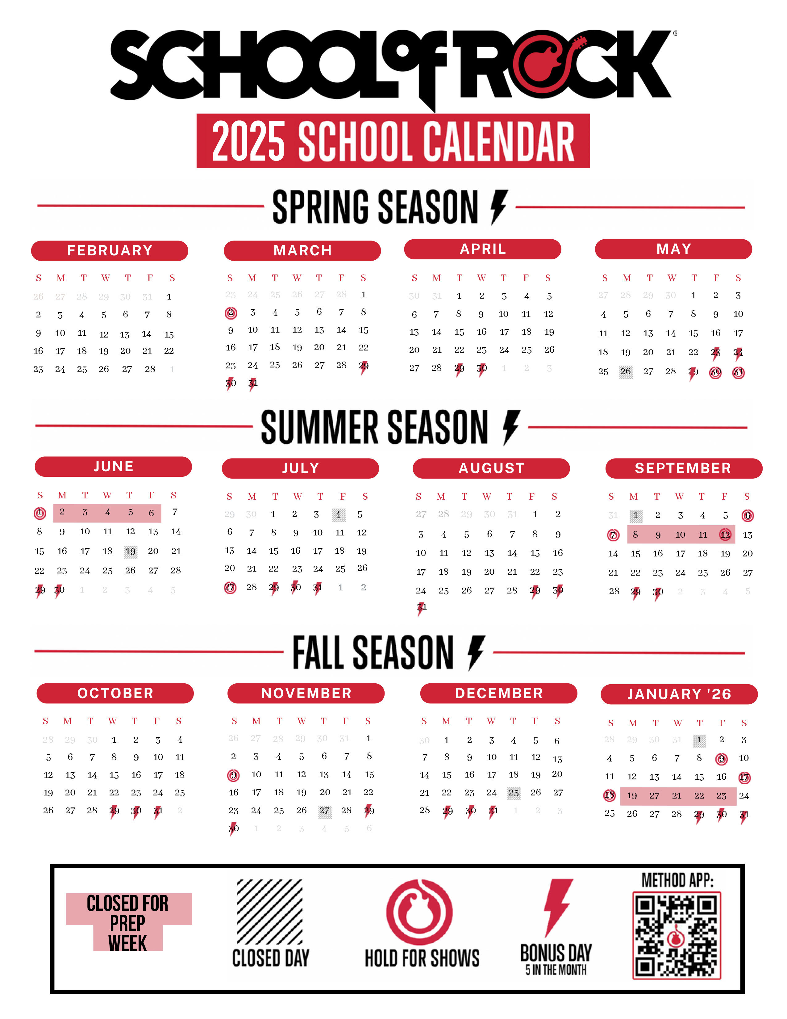 We do not offer makeup lessons or class prorations for the above holidays and prep-week. Because School of Rock is billed monthly, there are typically about four to five months out of the year when a student may receive five lessons/classes per month at no additional charge. This balances out any missed holidays and we strive to ensure that every student receives an average of four lessons per month over the course of a show season.